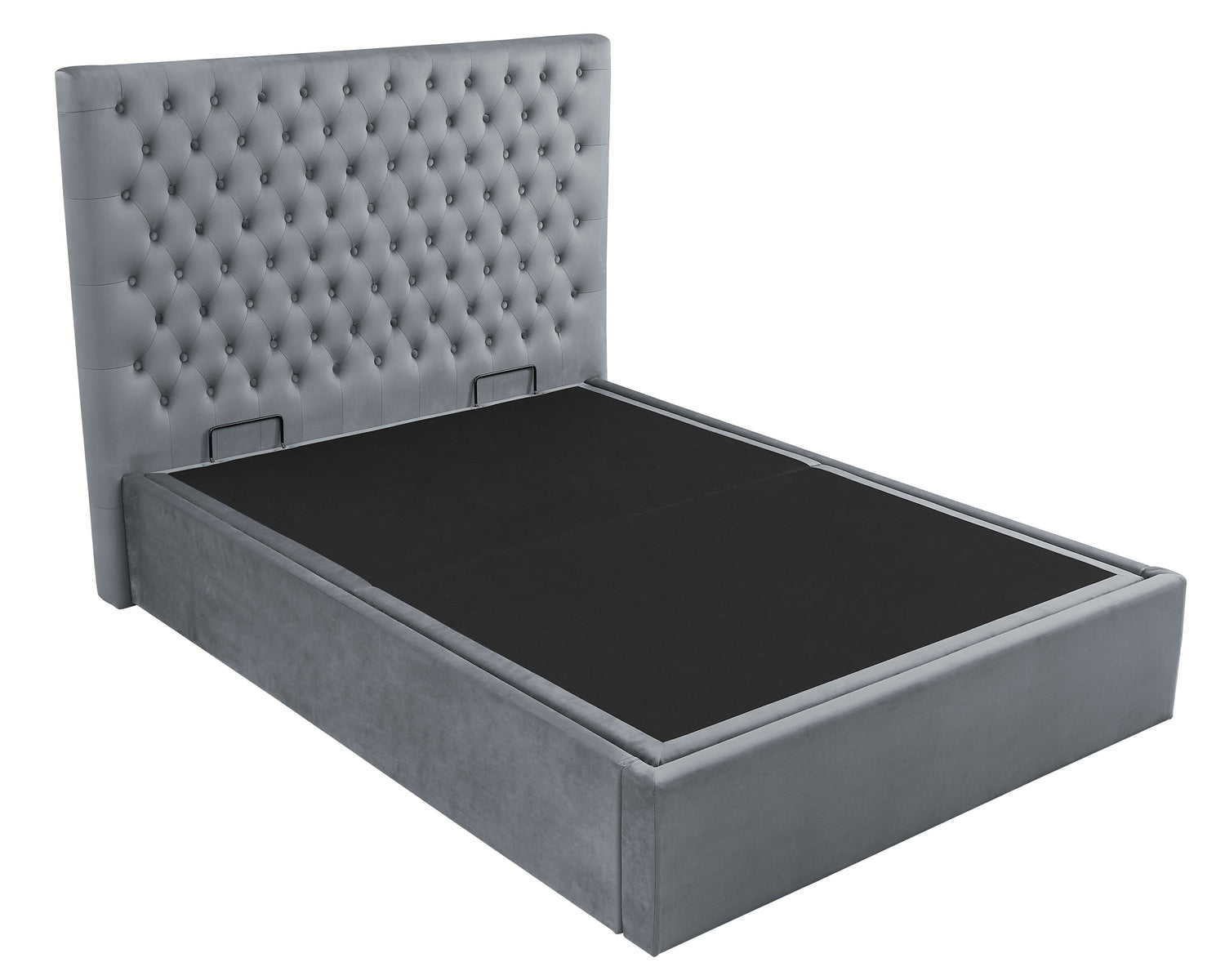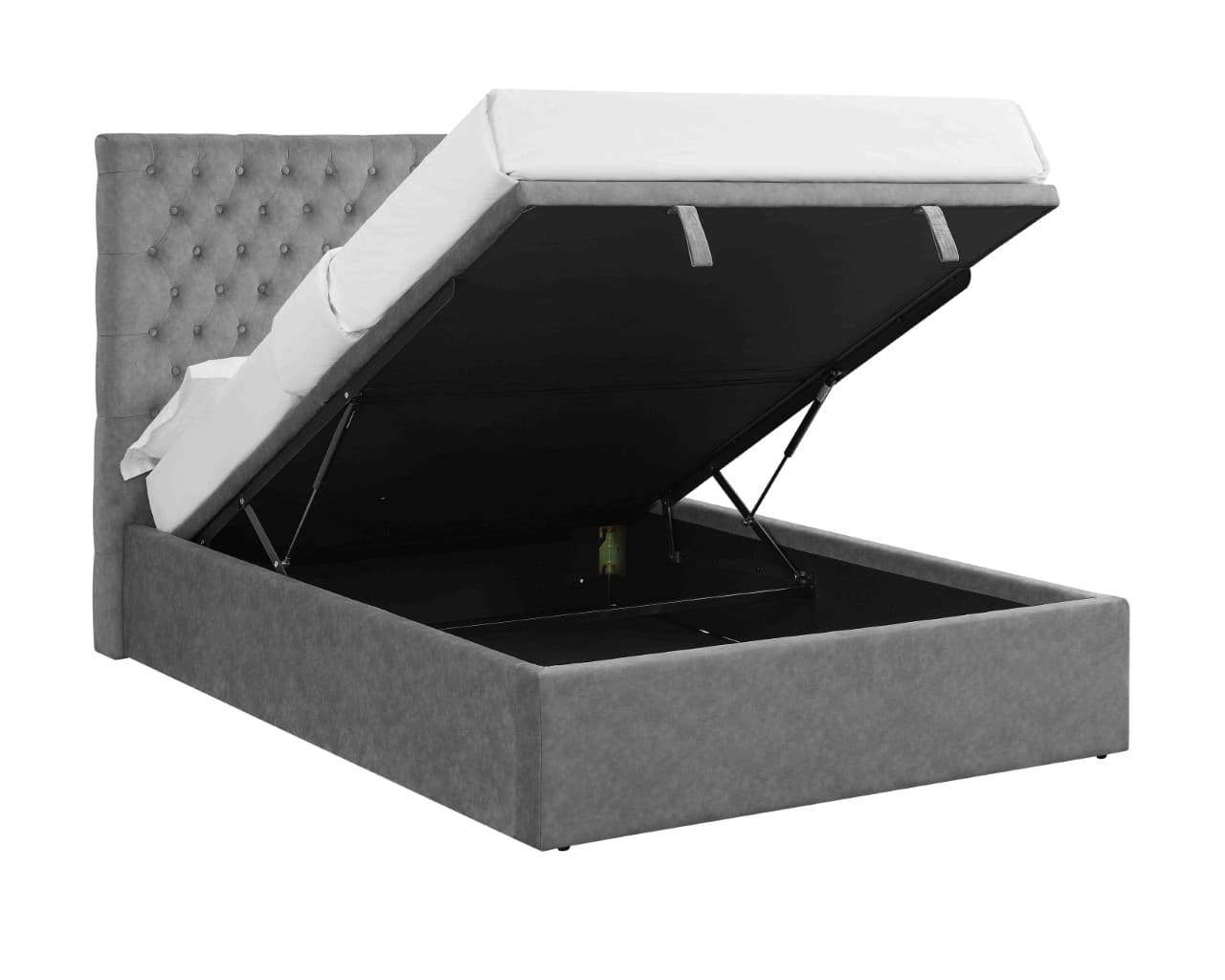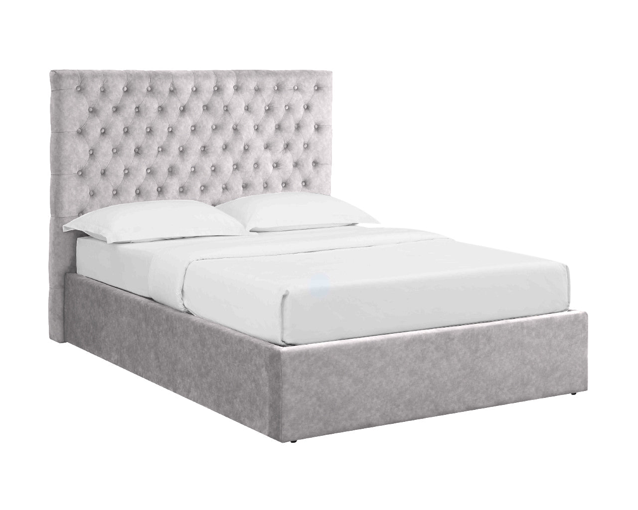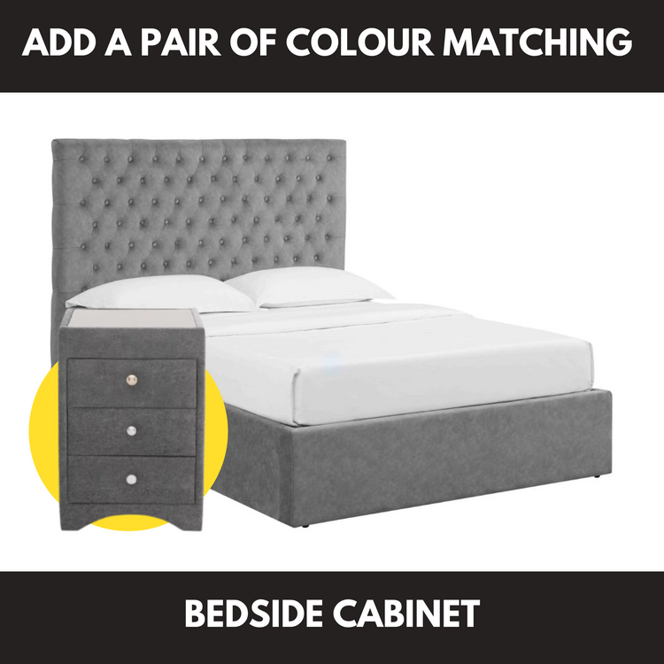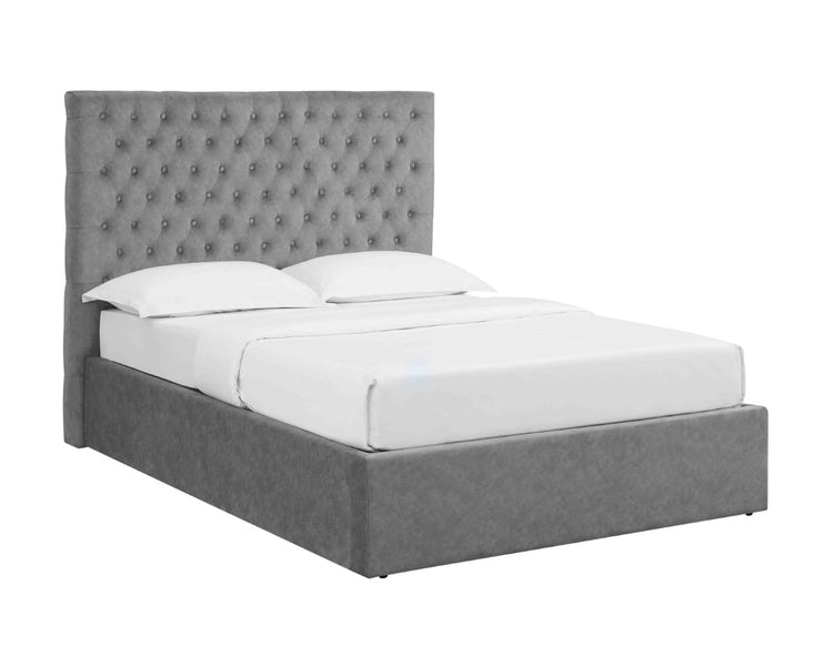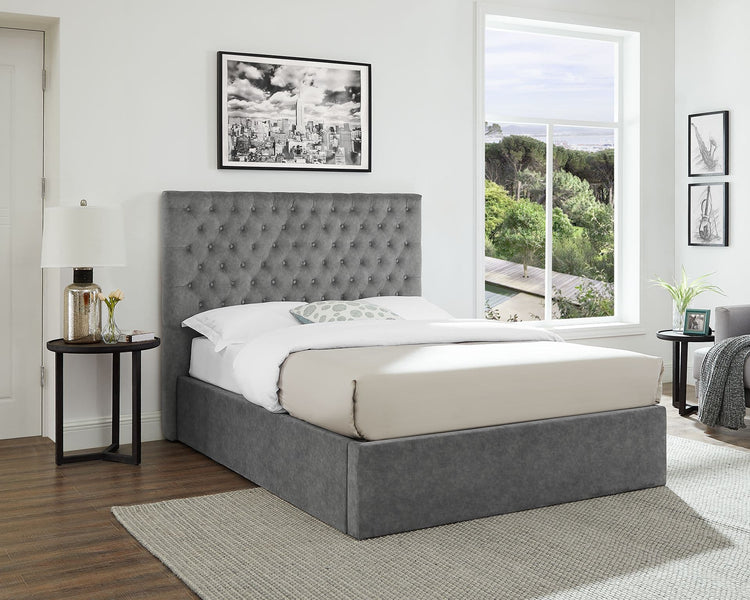 The ottoman base has an easy gas-lift heavy-duty mechanism and NO storage weight limit. Available in double, king and super king sizes. The great-value Buttoned Headboard Lift Up Ottoman Bed bedroom range is available in four great colours; Velvet Sky, Velvet Smoke, Wool Grey, and Velvet Silver.