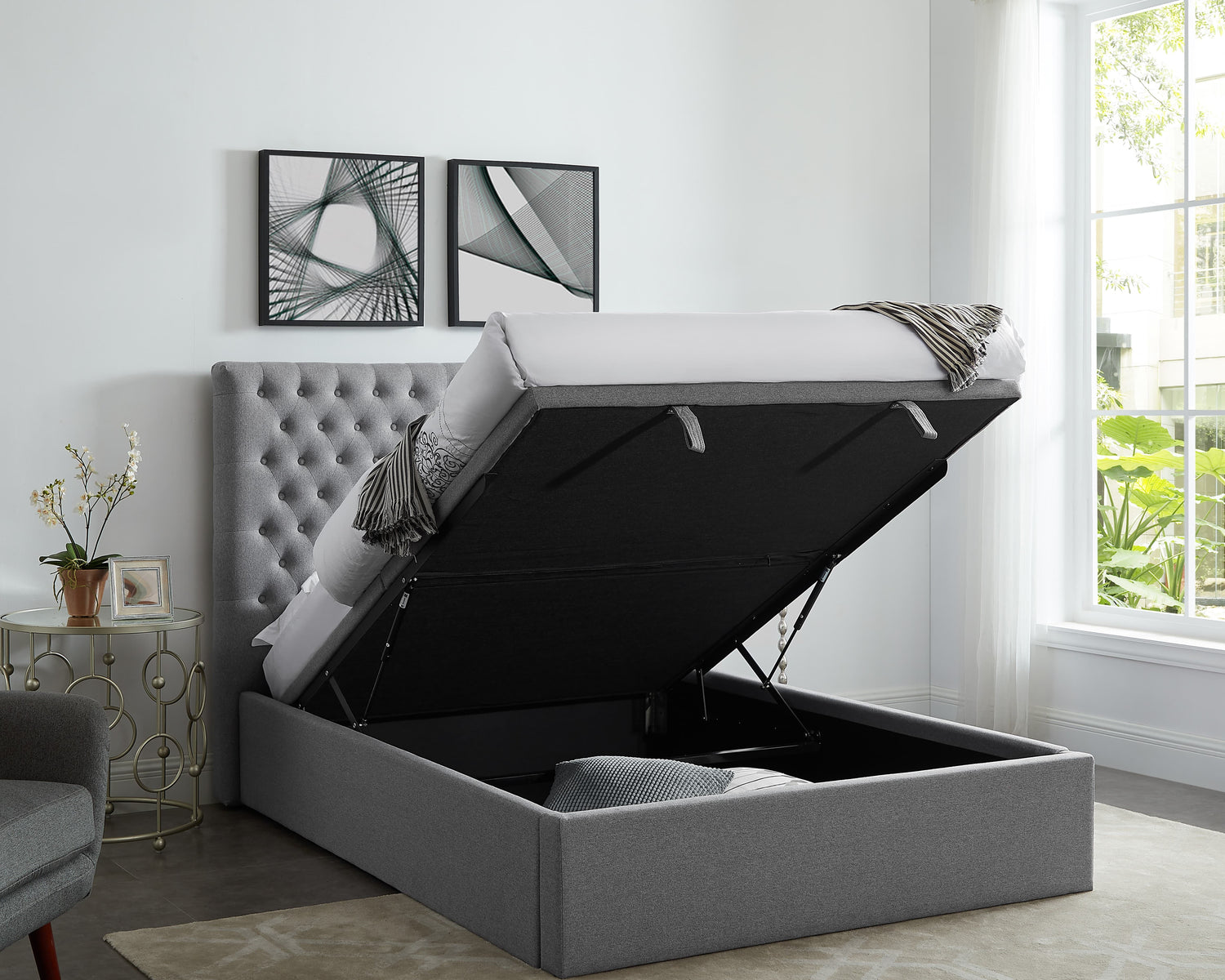 The large under-bed compartment, simple to use thanks to the easy lift gas mechanism, keeps your bedroom neat, tidy and clutter-free.